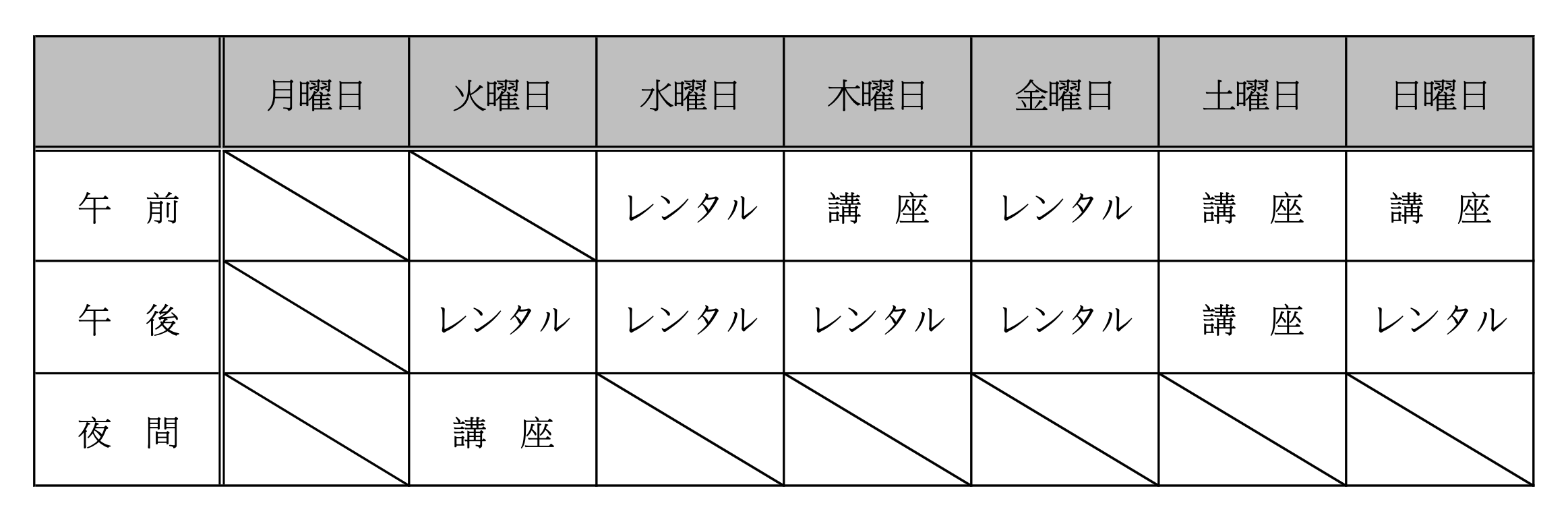 レンタルは比較的「火曜日午後」「木曜日午後」「日曜日午後」が空いています